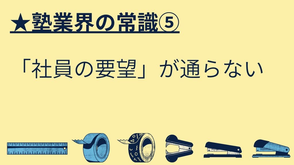入塾者数、退塾者数、合格者数、校舎の売上などのノルマがあると、どうしてもそれらのことが頭から離れることなく、常に意識した状態で仕事をすることになります。塾の方針や都合で動くことも多くなり、結果として塾生や親御様にとって満足度の高いサービスを提供することはできません。また、ノルマという社員にかかるストレスが授業への集中力を低減させ、塾生に悪影響を及ぼすこともあります。いつも疲れた顔をし、不機嫌な様子の講師は学習舎には存在しません。学志舎には営業・ノルマから解放され、全力で授業に向き合うことのできる、元気で上機嫌な講師しかいません。その結果、塾生も元気になり成長し、親御さんからも感謝されるという好循環が続いているのです。